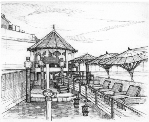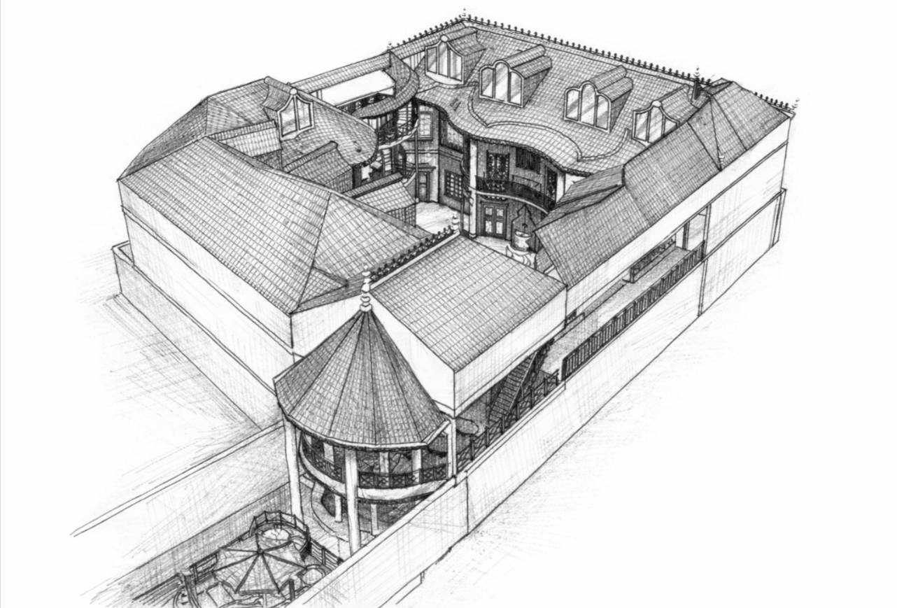 “An early twentieth-century, oneiric composition. An entrance house opening onto the Citadel main street, and a principal axis unfolding across the lake toward the mountains.”